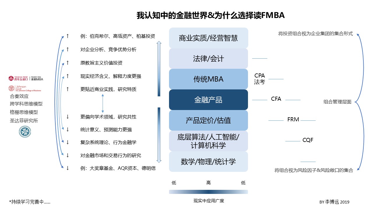 上图是当年我为申请五道口准备的一份不太成熟的自我梳理,阐释了我从专业角度选择清华五道口金融MBA的思考。以现实中应用最广的金融产品为核心,向上是真实的商业社会,向下则更接近于用自然科学的手段刻画金融市场和投资者行为,在投资上这两个方向做到极致的机构名称都如雷贯耳,他们也都取得了长期稳健的超额回报。