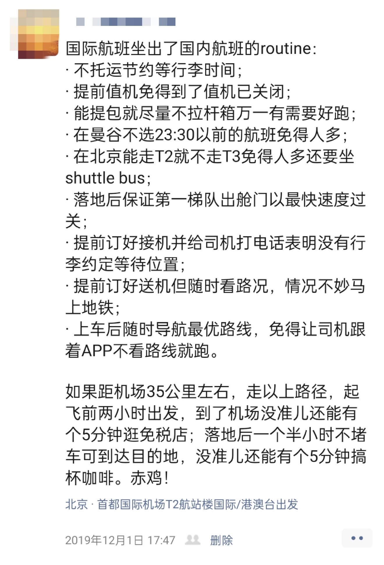 2019年12月,罗婷在朋友圈记录下如何最高效地往返于北京和曼谷