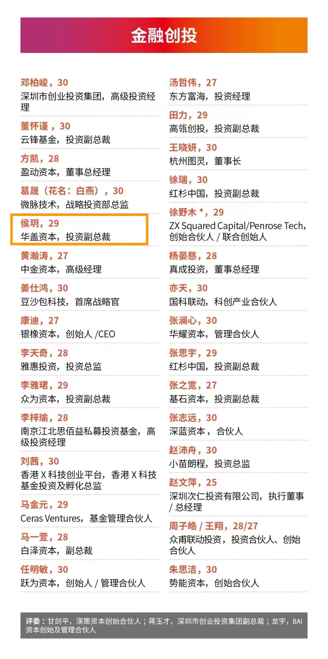 侯玥目前就职于华盖资本投资任副总裁。她表示,参选福布斯是她对过去工作和经历的一次小结和反思。进入私募股权投资行业以来,她时常鼓励自己更多地“跨出去”,也要求自己“踩得实”。她认为,能够投资行业内最优秀的企业,与最具创造力、最具韧性、最具毅力和勇气的创业者一道,不断探索技术突破、企业生存和人类社会的可持续发展问题,这是作为青年一代的幸运,也是作为青年投资人进步的源动力。