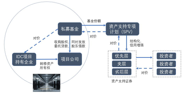 上述交易步骤可以在符合监管条件下同时操作,最后达成以下“资产支持专项计划-私募基金-项目公司-IDC资产”的交易方案: