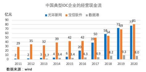 充沛的租金现金流:与美国同业类似,在移动互联网、5G、流媒体高速发展的今天,专业数据中心的需求整体强劲,因此上市的第三方IDC公司经营现金流稳定(主体为租金或叠加增值服务的外包服务费)且增长,光环和宝信的10年经营现金流复合增速为46%和11%,数据港的7年复合增速为21%。我们认为与下游大客户签订的长期租约能够有效保障IDC项目的现金流回款。光环新网出租率约70%,其有30%零售业务,虽然毛利率相对较高,但业务稳定性较宝信略弱。宝信软件出租率约为90%,主要经营3家客户,其中中国电信业务占50%。