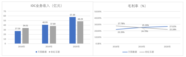 从业务毛利率来看,2018-2020年,万国数据毛利率不断提升,而世纪互联总体毛利率呈现下降趋势。2020年,万国数据IDC业务毛利率27.0%,而世纪互联IDC业务毛利率为22.3%。