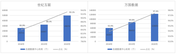 图12 万国数据和世纪互联2018-2020年自建数据中心机柜数量及占比