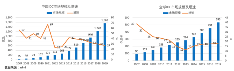 2019年,中国IDC市场规模达到1562亿人民币,增速27%,已经连续10年以上保持20%的年增长。相对于全球约535亿美元的整体市场,中国IDC十多年的发展增速更快,2017年中国市场已占到全球规模的19.9%。