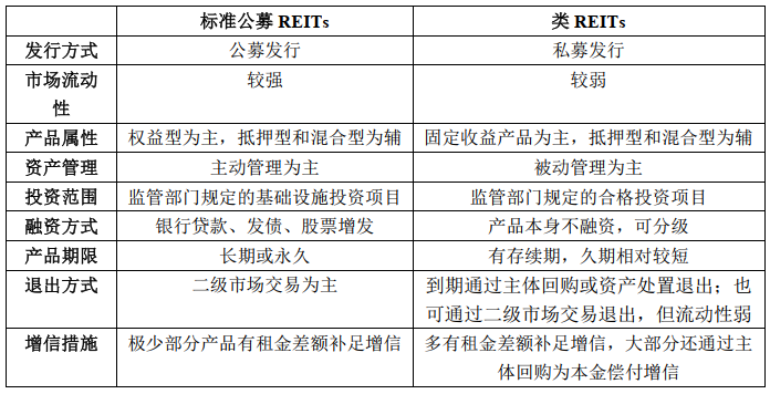 从2004年国务院出台文件提出推进资产证券化后,由于现行政策的限制和缺乏明确的REITs制度设计,在一段时期内国内只发行过类REITs产品。直到2020年《关于推进基础设施领域不动产投资信托基金REITs试点相关工作的通知》、《公开募集基础设施证券投资基金指引(试行)》等政策文件出台,公募REITs使用“公募基金+ABS”的规则才被明确建立起来,但目前仅限于基础设施类投资,包括互联网数据中心(IDC)项目。为了符合发行主体的战略规划和满足投资项目的不同资金需求,可以灵活采取两种模式:公募REITs和私募类REITs。下表比较公募REITs和类REITs的区别: