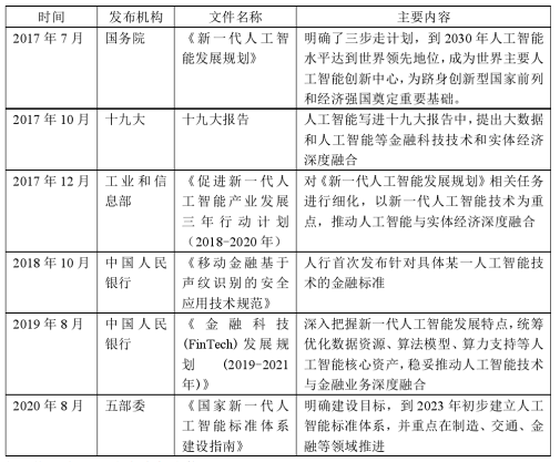 从政策上分析,我国虽然将AI列入国家战略层面,同时也在积极整顿金控公司(如蚂蚁金服等),行业浪潮和政策导向均开始回归技术本身。2017年7月,国务院发布了《新一代人工智能发展规划》,正式从国家层面对人工智能进行系统布局,国家重点对金融提出了自动化和智能化的发展要求,要求到2020年,人工智能水平与世界同步,2030达到世界领先水平(表1)。