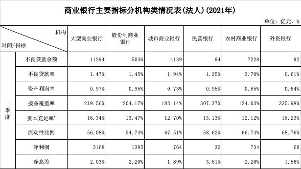 以银保监会发布的2021年一季度商业银行主要指标主要情况为例,城市商业银行与除农商行之外的其他银行类金融机构相比,显著存在不良贷款率更高,资产利润率、拨备覆盖率、资本充足率及净息差均更低的特点。