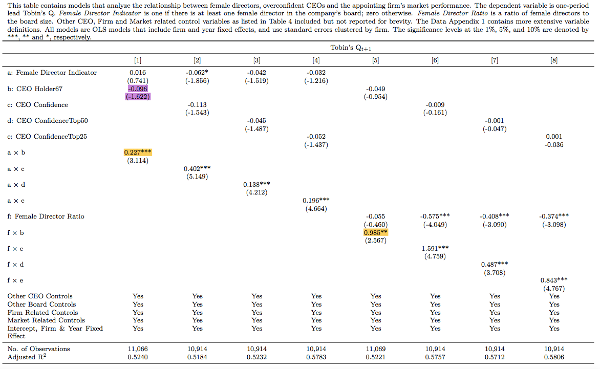 First, let’s set up some parameters and context useful for our analysis. The direct impact of female presence in the board room is rather difficult to measure and inconclusive in the available literature since positive correlation (Campbell and Minguez-Vera, 2008), negative correlation (Ahren and Dittmer, 2012), and no correlation (Adams and Ferriera, 2009) all coexist between the link of female directors on the board and firm performance. Fortunately, most literature concurs on - a greater fraction of female directors appears to increase firm value – but under the condition of when the CEO is ‘overconfident’.