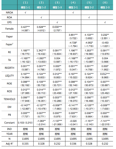 - To test the extent of female director presence, we examined using a Chinese A stock comparative study. The study chose performances of Chinese A stock companies between 2013 to 2017 and set 3 explanatory variables: female directors(Female), proportion of female directors (Feper) and square of proportion of female directors(Feper2). Least squares methods was used to conduct hypothesis testing.