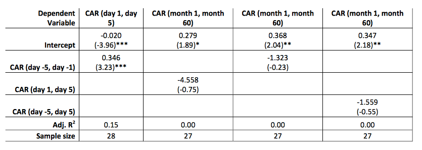A cross-sectional regressions comparing abnormal returns from different time periods related to the announcement of female appointment to the board of directors was also run to showcase this effect, as seen in Table 3. In comparing the cumulative abnormal returns from five days to one day prior (-5, -1) to the date of announcement with the cumulative abnormal return from one day to five days after (1, 5) the date of announcement, we found a statistically significant positive relationship. In comparing the long-term cumulative abnormal returns to announcement period returns (day -5, day -15), the relationship found was not statistically significant, meaning that the long-term returns are not related to announcement period returns. This holds true after it is revealed that the newly elected director is female, as shown through the regression between (month 1, month 60) and (day +1, day +5) having no statistical significance. These results show that neither is the market inefficient nor is the announcement period reaction suggesting a negative reaction to female appointment.