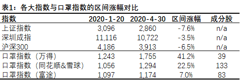 2020年初至今,新型冠状病毒疫情在我国乃至世界范围内肆虐,对经济运行和社会发展产生了重大的负面影响。自1月20日晚间,钟南山院士在央视《新闻1+1》节目首度确认“肯定有人传人”,至4月30日,北京突发公共卫生事件响应级别正式调整为二级,代表中国A股的三大指数上证指数、深圳成指、沪深300指数均大幅下挫,而与疫情相关的“口罩指数”却大幅上扬。具体见表1: