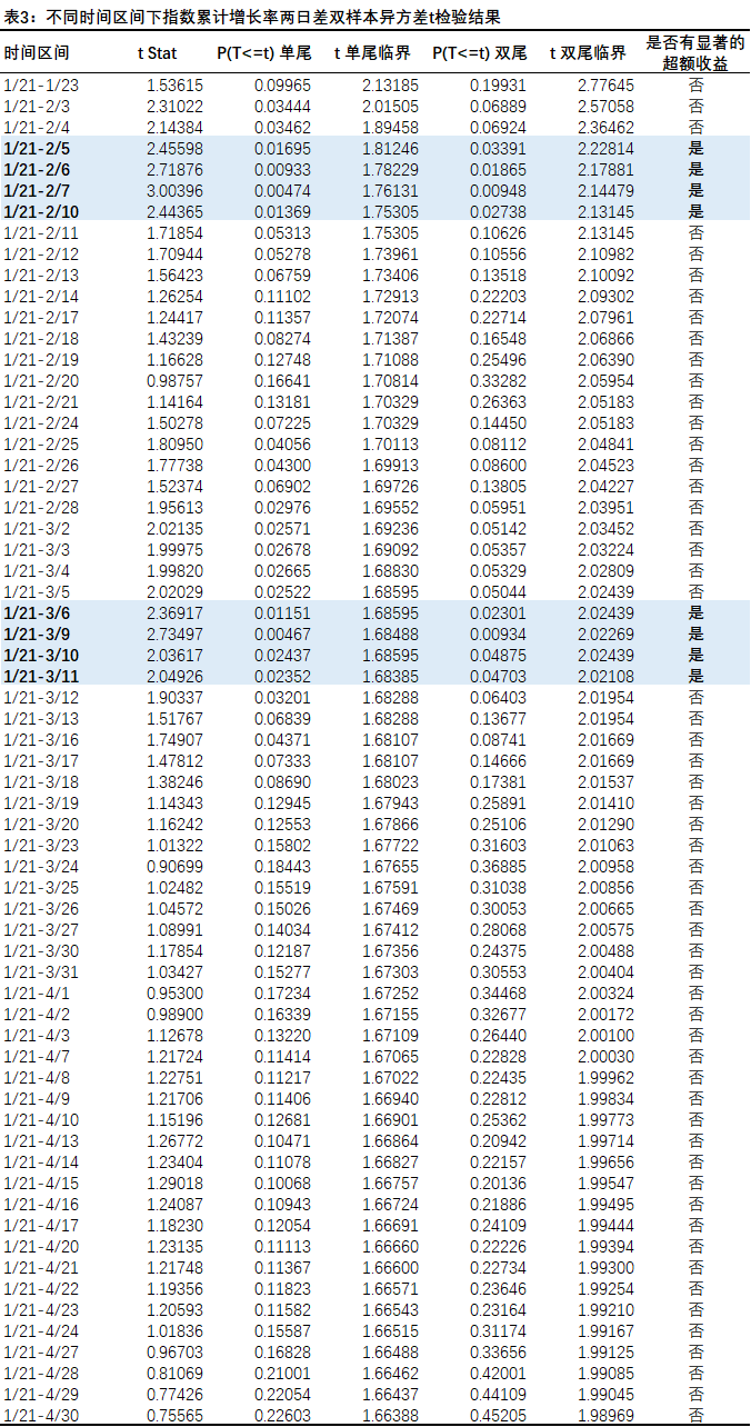 于是笔者又对自1月21日开始的每天的累计增长率两日差进行多次双样本异方差t检验,结果显示(置信水平仍为0.05),自1月21日始,到2月5日-2月10日期间,口罩指数有显著的超额收益(笔者将其定义为单尾和双尾检验均拒绝原假设),之后又不显著,然后到3月6日-3月11日期间,口罩指数有超额收益,之后超额收益又不显著。具体见表3: