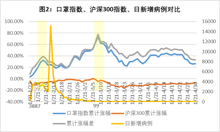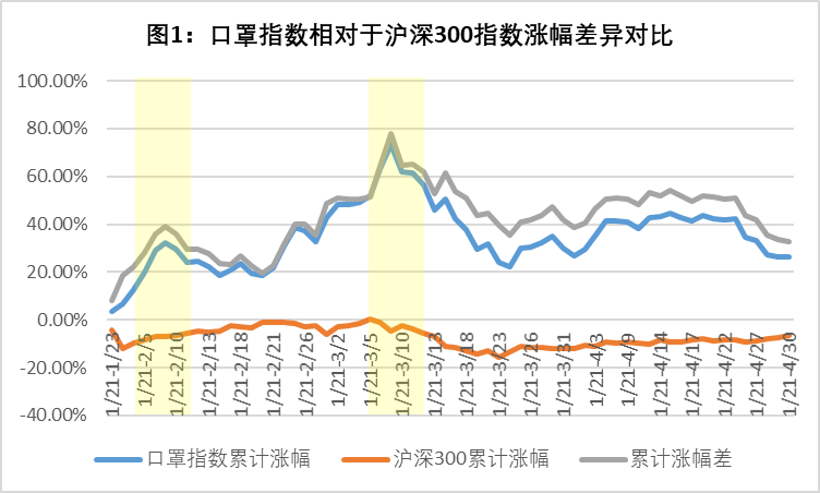 图1 口罩指数相对于沪深300指数涨幅差异对比