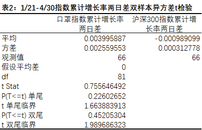 考虑到口罩指数累计收益率明显比沪深300指数高,笔者对1月21日至4月30日间两指数的累计增长率两日差进行了双样本异方差t检验,结果在0.05的置信水平下,均值差异不显著(p>0.05),即1月21日至4月30日间口罩指数没有统计显著的超额收益,具体见表2: