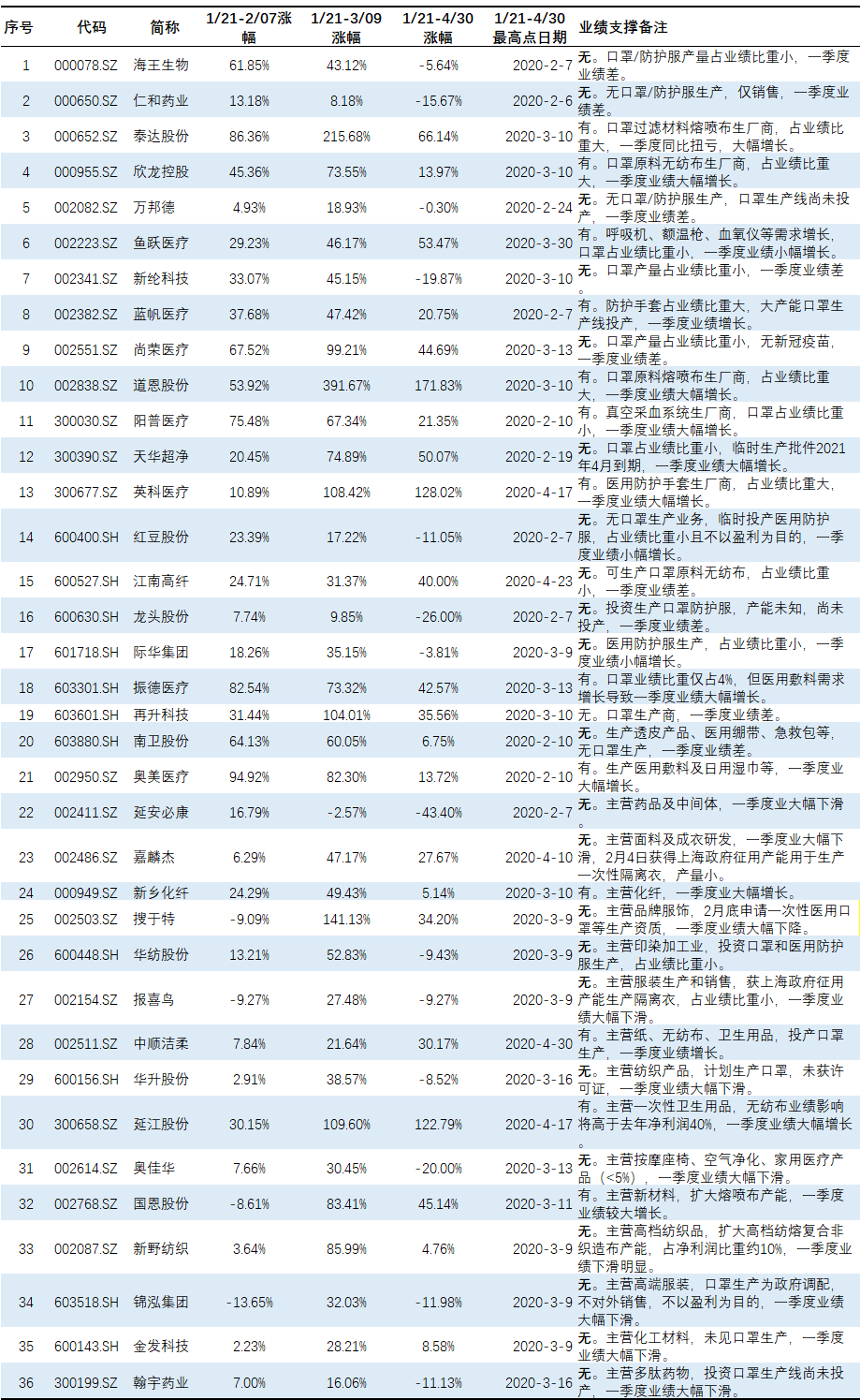 以搜于特(002503.SZ)为例,其股价在1月21日到2月7日之间涨幅为-9.09%,1月21日到3月9日之间涨幅达到141.13%,期间涨幅排名36只成分股第三。而相比之下,其2019年度收入同比下滑30.12%,净利润同比下滑43.81%,一季度收入同比下滑57.92%,净利润同比下滑169.32%,可以说业绩处于持续下降通道。根据其2019年度报告,其主营业务为从事品牌服饰运营、供应链管理、品牌管理等,并不包含口罩或医疗相关用品的生产销售。但在2月12日,公司公告将设立子公司以研发、生产、销售医用卫生口罩、防护服、纱布、无纺布、普通劳保用品、卫生用品等,后股价多次异常波动,2月28日,公司实控人通过大宗交易减持公司股份 813.44万股。经深交所问询,3月11日,公司公告回应问询称口罩生产主要满足国家统一调配,尚未对外销售,也未准确披露产能和对业绩的影响。由此可见,该公司投产口罩并不能为公司提升多少盈利。类似公司不在少数,这里就不再一一列举。