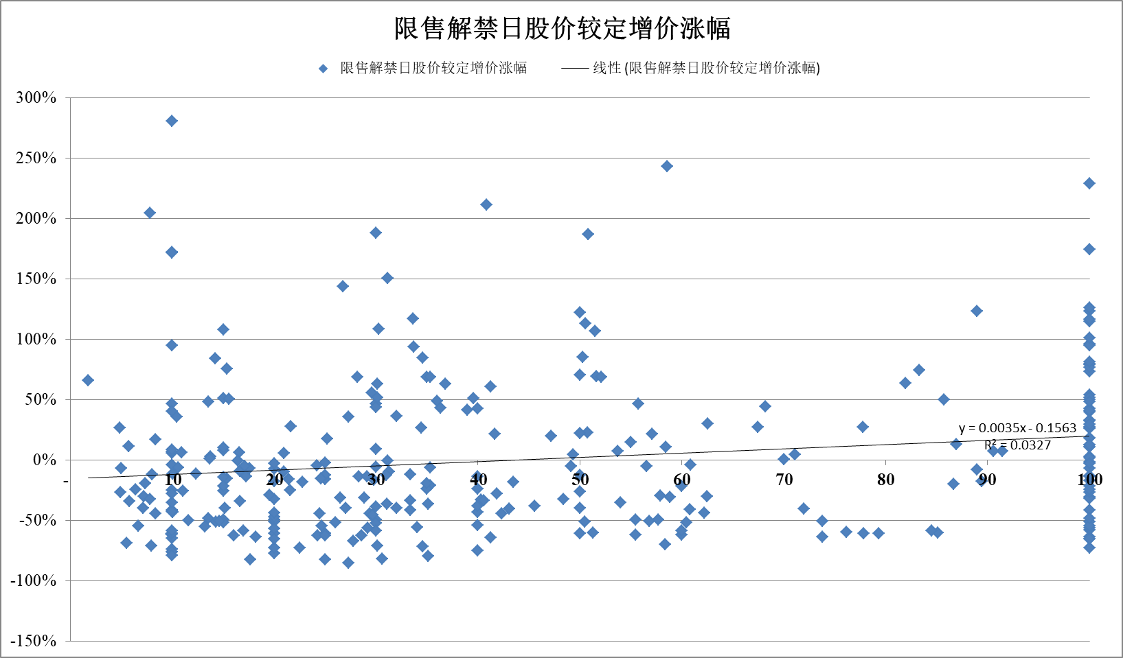 图1  2013年1月1日至2016年4月1日控股股东参与的A股纯定向增发项目限售解禁日股价较定增价涨幅图