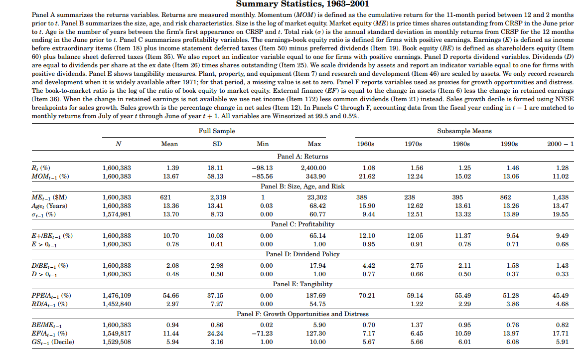 承接2.2市场情绪理论研究概述,本部分对市场情绪的代表性研究进行了详细论述,以引出套利交易策略的设计。结合Baker和Wurgler[11]的实证分析研究,他们对1963-2001年的数据做了各个维度的整理汇总,包括历史各期回报率、动量、成立年限、标准差、每股盈利、股票市场公允价值、股票账面价值股利、固定资产、外部融资,详见下图。