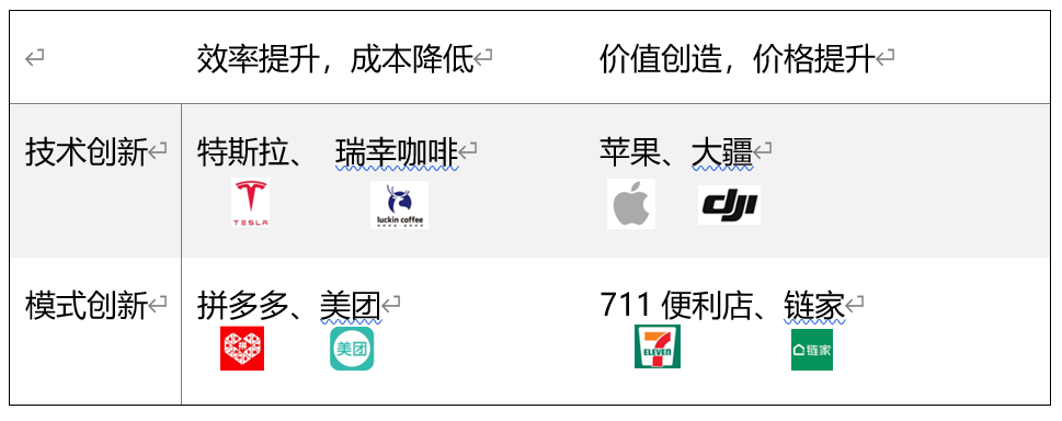 从创新的定义入手,分场景讨论了技术创新与模式创新对企业价值创造的内生逻辑。通过特斯拉、苹果、拼多多及7-11便利店的案例及数据,我们可以清晰地看到从创新到企业价值的传递逻辑和脉络,即通过效率提升或价值创造来实现产品或服务成本降低或价格提升,进而到处其毛利率水平的提升,实现企业价值的创造。