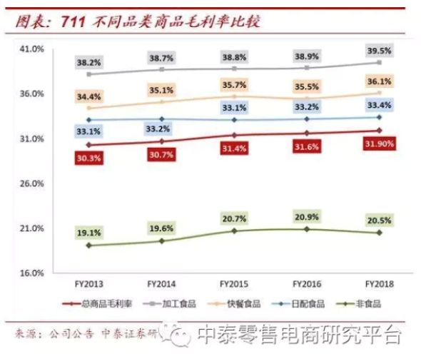 聚焦到行业领头羊7-11,公司在2018年财报中披露其整体毛利率为31.9%。其中,毛利水平较高的是加工食品与饮料,为39.5%;其次是快餐速食,为36.1%,第三为日配食品,毛利水平为33.4%。