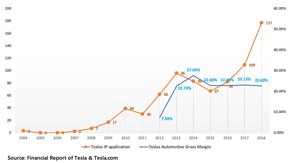 图4 特斯拉公司专利申请数与毛利率相关性对比