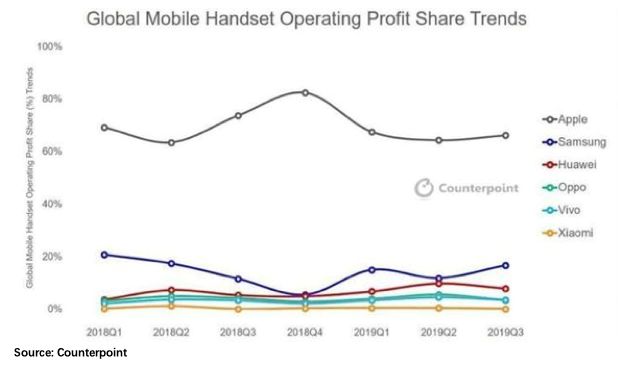 图7 2018-2019年Apple与各大厂商毛利率变化趋势