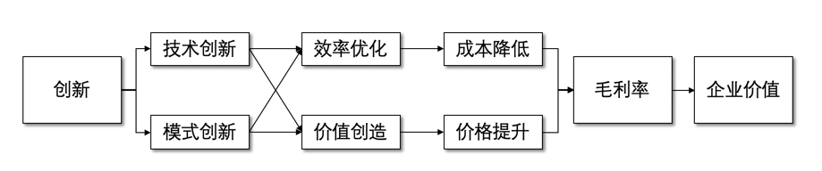 其中,假设当前的创新可以被归纳为技术创新或模式创新两种。在此基础上,我们假设在同等条件下,上述不论哪一种创新,最后都能带来企业效率的优化,或者使得附加在产品、服务上的用户价值被创造。对应于效率优化,则企业生产系统的成本水平将会降低;对于价值创造,则企业所提供的产品或服务的市场价格将有机会提升。根据“毛利= 售价 – 成本”的逻辑,则企业对应的毛利率水平将因为前端的创新而被提升,最后实现企业价值的增长,二者正相关。