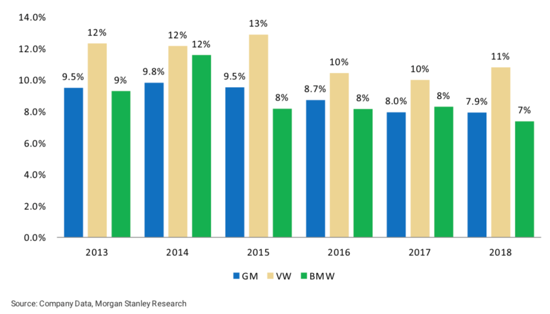 对比美国汽车行业水平为11.45%,而同期在华汽车企业(通用、大众、宝马)的毛利水平约仅为13%[5]。