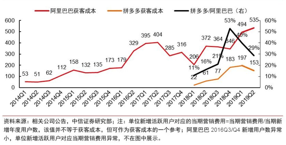 与其商业模式配套的,是拼多多依靠用户自传播而带来的“获客成本成本”降低。与淘宝、京东上越来越高昂的流量成本相比,2018年Q1,拼多多的获客成本为22元/人,几乎是同期淘宝206元/人的11%;延展到2019年Q2,当淘宝的获客成本疯长到535元/人的情况下,拼多多凭借其模式创新,依然维持在153元/人的水平[8]。仅这一项,就给拼多多商家创造了71%的成本优势。由于这一优势的根源是底层商业模式的创新,使得阿里、京东等巨头很难在一时间模仿和反超。