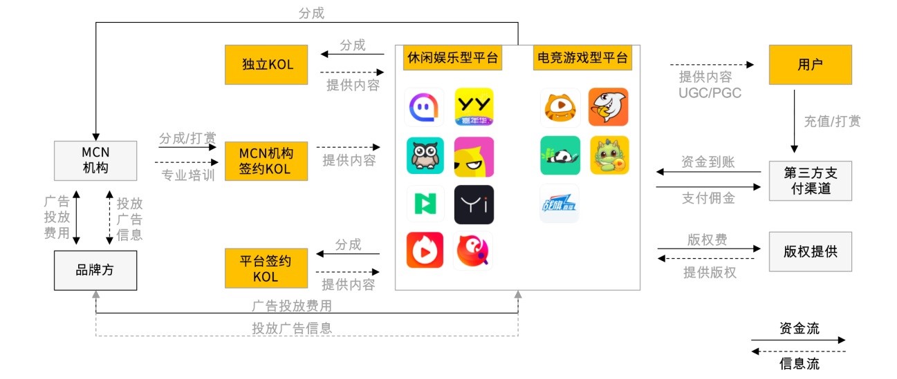内容分享模式主要由C端用户打赏付费型和B端商家广告营销型构成,内容分发平台大致可以分为休闲娱乐类和电竞游戏类,平台形态可以是直播形式或短视频形式。KOL可以为独立展业、MCN签约、平台直接签约等三种方式,其中MCN签约的KOL占据了市场主流。