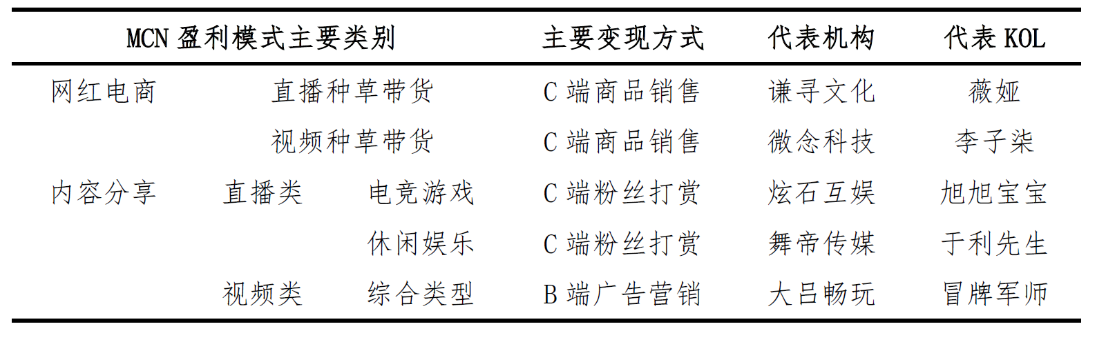 MCN衍生出了多种变现方式:其中针对B端的变现方式包含了商业合作、流量分成、平台补贴、广告营销和IP授权收入等;针对C端的变现方式包含了衍生品销售、红人电商、直播打赏、内容电商、知识付费等。若从变现过程中是基于有形资产或是无形资产来看,MCN的商业化路径可以分为以种草带货为代表的网红电商模式和以营销付费为代表的内容分享模式等两大类别,内容展现形式则主要分为直播和视频等两种内容分发平台。