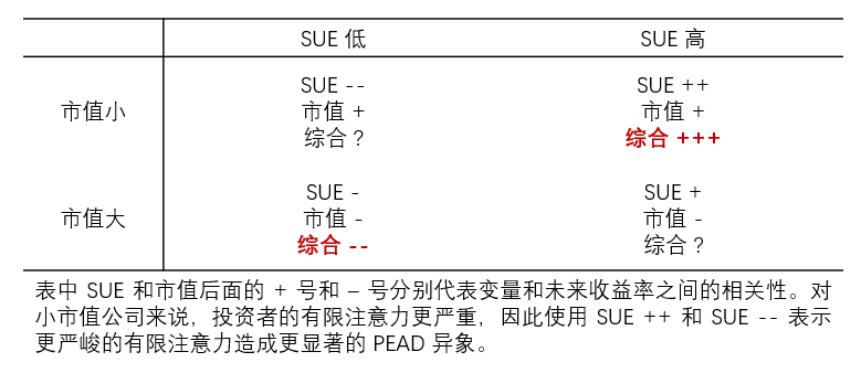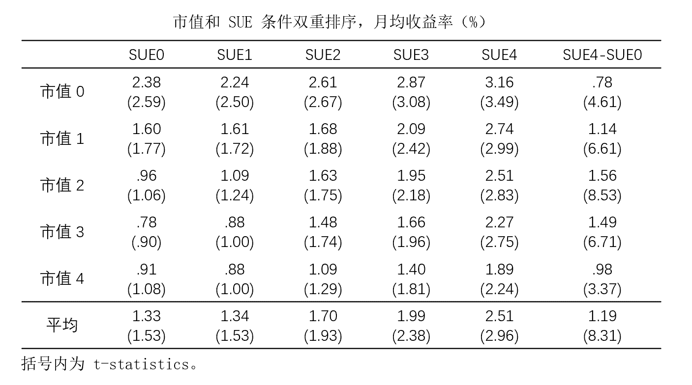 从根据异常换手率和SUE以及市值和SUE的两个双重排序结果中,我们都观察到了一个现象,即靠右上角的部分,即关注度最低并且业绩超预期程度最高的组别,月均收益率显著更高;而靠右下角部分,即关注度最高且业绩达到预期程度最低的组别,月均收益率显著更低。
