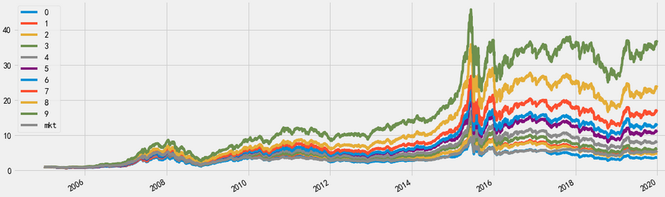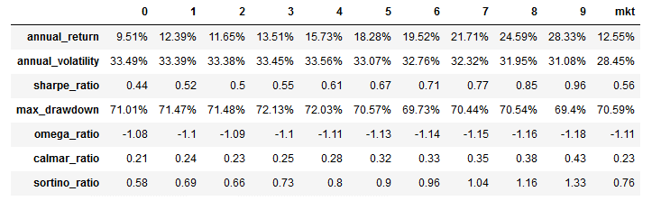3)每组内股票按总市值加权,按月再平衡,计算每个投资组合的月均收益率。最后结果如下表所示: