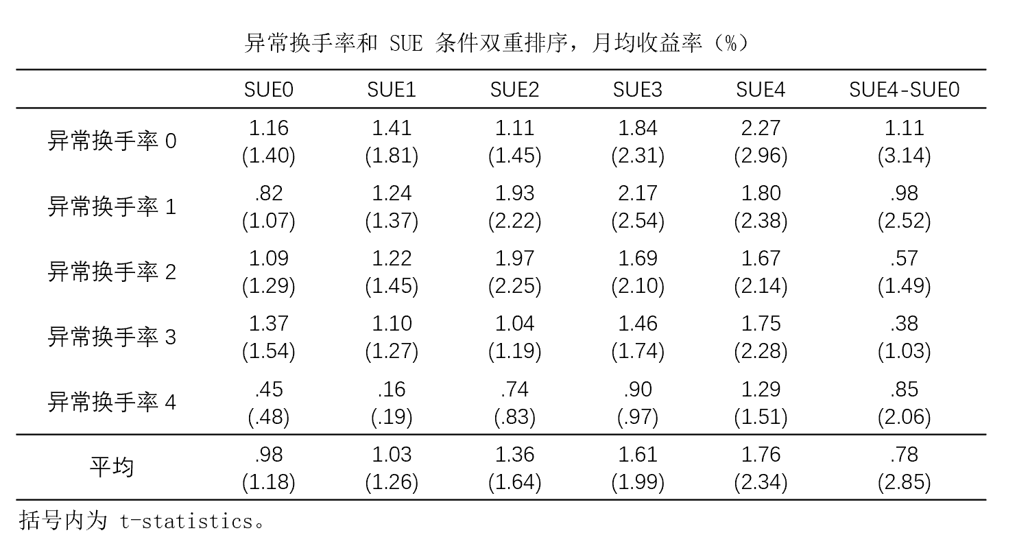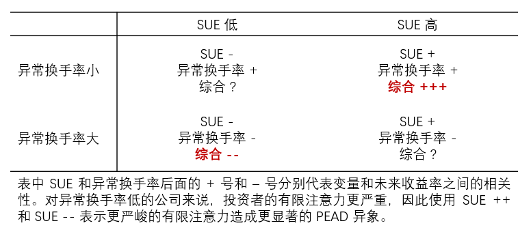 表格中的最右一列是给定异常换手率下,利用SUE4 - SUE0构建的对冲组合,即PEAD异象。可以看到,在异常换手率0到3组,无论是预期收益率还是其t-值都单调下降,说明PEAD异象随着有限注意力问题的减弱而减弱,符合先验猜想。唯一的例外是最后异常换手率最高的一组,由于异常换手率4/SUE0这部分极端股票的收益率太低,导致该组内PEAD异象收益率也很高。但总体来看,上述结果支持了猜想,即股票的关注度越低,PEAD异象越显著。