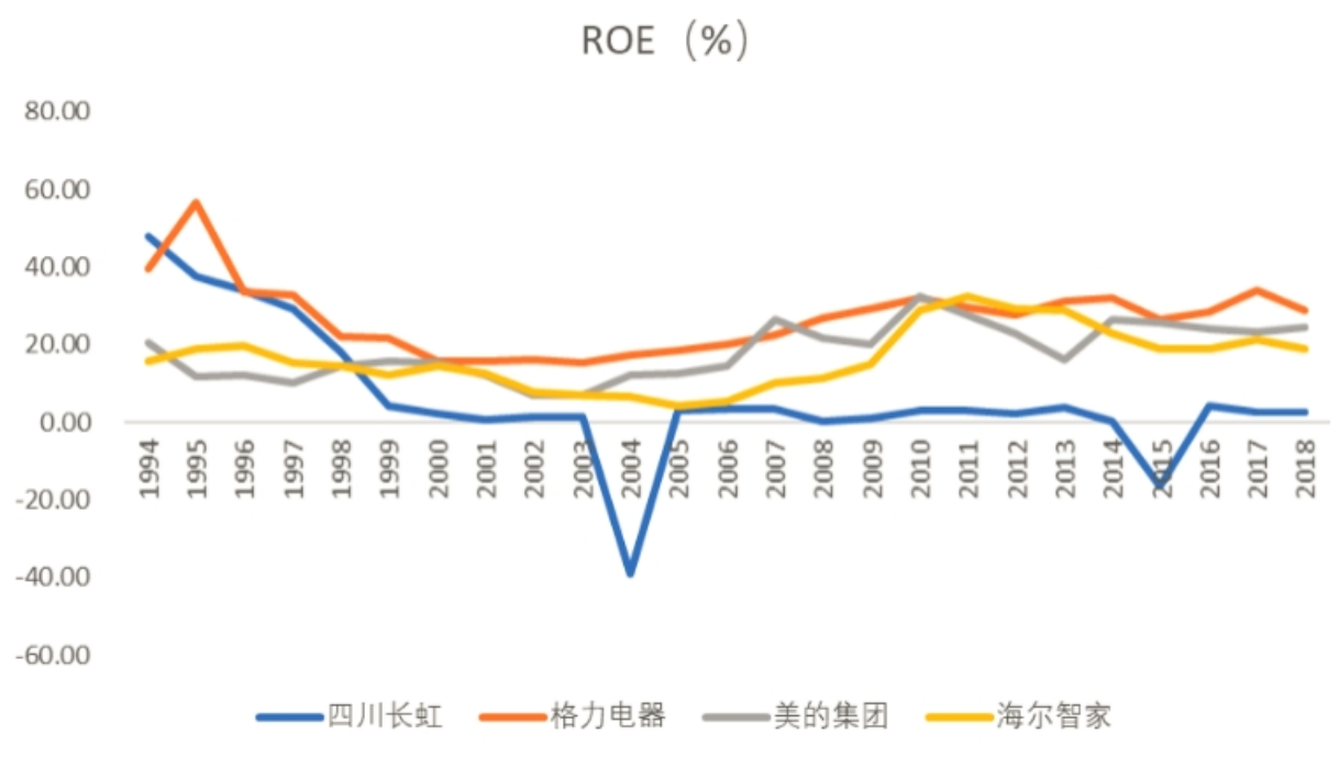 从净资产收益率指标来看,格力电器、美的集团、海尔智家三家公司在1994-2018年期间的ROE走势整体平稳,在经历了21世纪初的行业洗牌后反而出现逐步优化的趋势,而四川长虹则自1999年起便陷入挣扎,ROE一路走低,且与其他三家公司相比差距越拉越大。2018年度,格力电器、美的集团、海尔智家和四川长虹的ROE分别为33.40%、25.80%、20.78%和2.49%,出现了较为明显的梯队化。