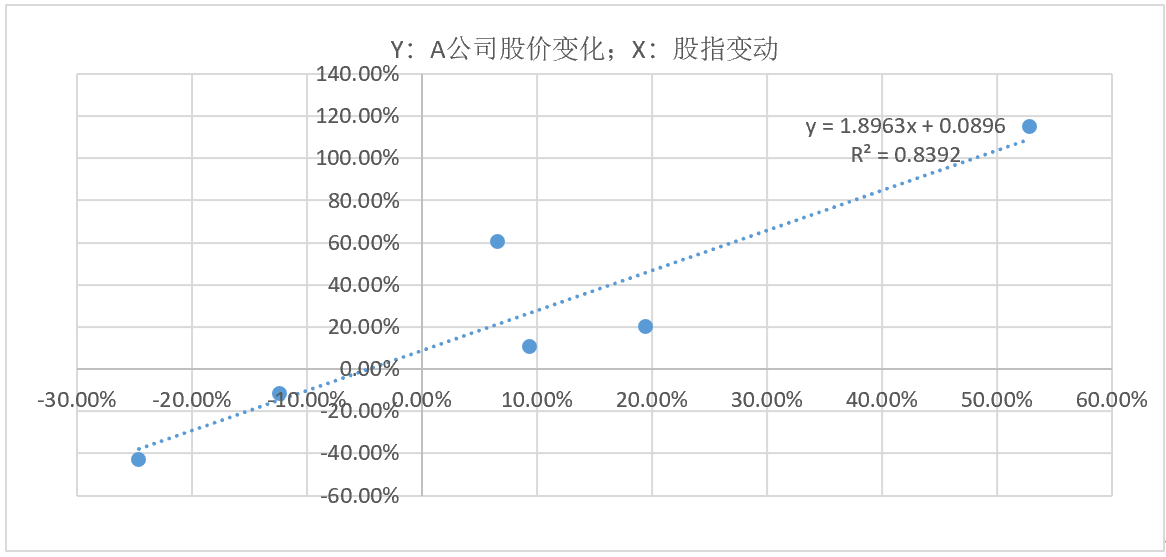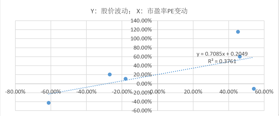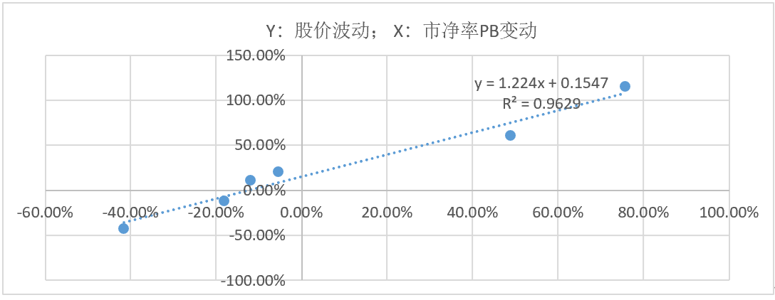进一步分析该公司股价变动对该公司市盈率变动变动建立简单的回归方程,可以发现市盈率(PE倍数)指标的变动对股价变动虽然存在正相关关系,但其解释度非常弱,对应的R方仅0.3761。另一方面,市净率(PB)的变动与股价变动存在显著正相关关系,而且方程的R方系数为0.9629,非常好的解释了股价变动的,对样本公司A来说,市净率变动对股价的解释度甚至并不亚于PEV。