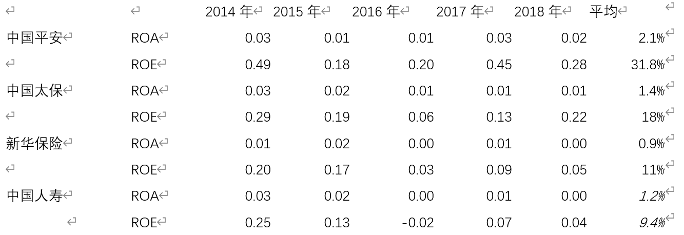通过以上简化分析,可以发现ROA水平是影响一家公司PB倍数的关键的因素,进一步对几家上市保险公司的ROA水平进行横向比较可以发现其净资产收益能力方面存在着显著的差异,例如,中国平安可以做到两倍于行业均值的水平。