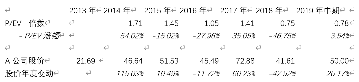 通过对以上数据简单变动分析可以很容易看出,该人身险公司在过去6年时间里的内含价值一直保持着较高的增长速度,新业务价值率提升显著,每股净资产以及每股盈利能力也持续改善。但与此相反,该公司P/EV倍数一直处于1.5左右的水平且呈不断下降的趋势。在整个A股市值严重承压的2018年、2019年,该公司的P/EV倍数甚至严重低于1倍,可见市场因素对人身险公司估值影响之大。