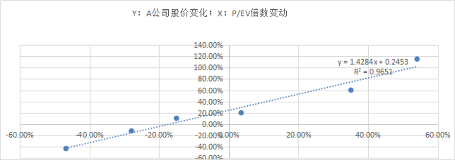 进一步分析估值P/EV倍数变化与该公司股票变动幅度的变化相关性可以发现,P/EV倍数非常有效的反映了A公司股价的变动情况,回归方程的R方高达0.96,这也进一步印证了市场的有效性以及P/EV倍数估值的主流地位。