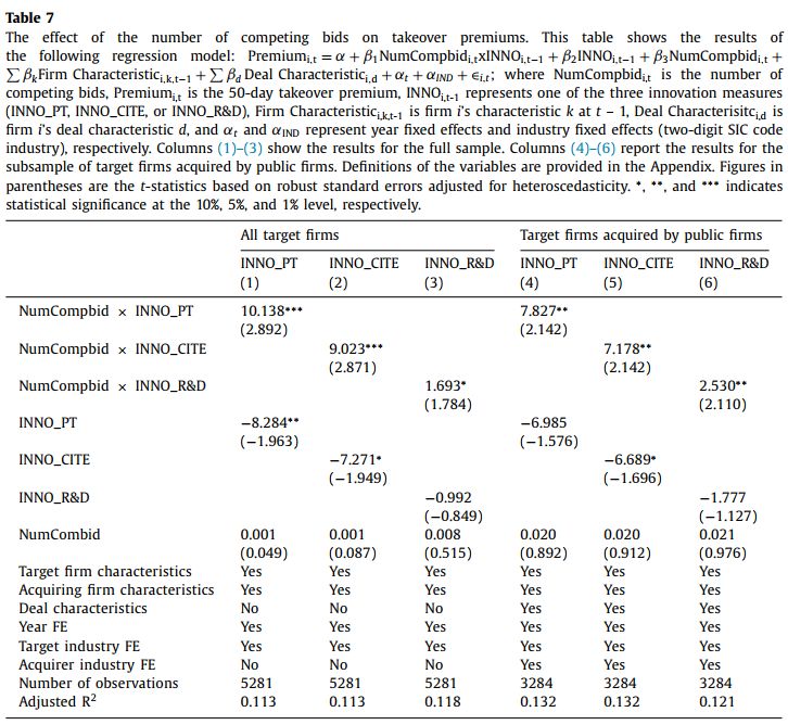 (3)参与收购的竞争者数量与收购溢价的关系:回归模型为Premiumi,t= α + β1NumCompbidi,t*INNOi,t-1+ β2INNOi,t-1+ β3NumCompbidi,t+∑βkFirmCharacteristic + ∑βdDeal Characteristici,d+ αt+ αIND+ ∈i,t。即在上述收购溢价回归模型中增加了参与收购竞争的公司(NumCombid)作为解释变量,通过z-统计量测试,证实了参与收购竞争的公司数量(NumCombid)与原先三个研发解释变量的相关系数均为正且显著(5%显著性水平下),说明参与收购竞争公司数量可以放大企业创新对收购溢价的正向影响。