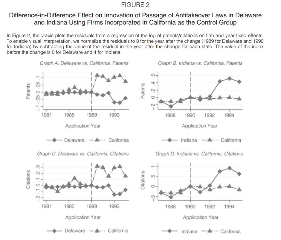 (2)基于Sapra、Subramanian[5]等人的研究,发现创新与外部收购壁垒(或收购压力)之间存在“U型关系”——收购壁垒很小(公司治理有效,市场化程度较高)和收购壁垒很大(反收购)时,企业的创新活动会显著增多,而收购壁垒程度适中时,企业的创新活动会显著减少,与上述(1)中的观点呼应。本研究通过建立模型,论证“U型关系”可能是预期的收购溢价和公司控制权利益交互影响所致,即仅在收购压力过小或过大时,企业创新活动才能得到激发。如下图所示,将收并购限制法案的特拉华州,与对照组一直未颁布收并购限制法案的加利福尼亚州对比:刚通过法案后,特拉华州创新活动明显下降;而法案逐渐运行平稳后,特拉华州的创新活动有明显的增加,随着法案的推进呈现“U型”分布。