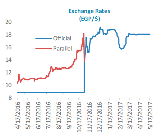 2016年11月3日早晨,顶着巨大的压力,埃及中央银行(“CBE”)做出了震惊市场的举措,宣布埃及镑(“EGP”)对美元完全自由浮动。同日,CBE将利率上调300基点。汇率自由浮动旨在削弱黑市交易,使外汇交易和资金回归银行系统。不到一个月的时间内,据埃及中央银行的统计,银行系统已经吸收了超过30亿美元的外汇。