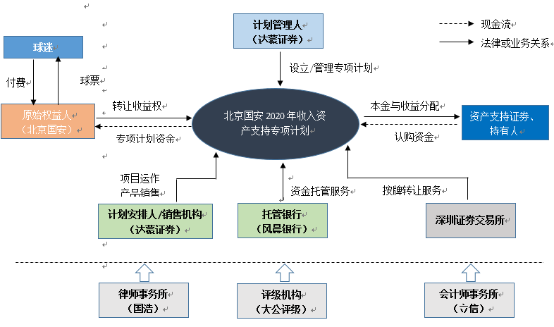 本专项计划由达蒙证券资产管理有限公司发行,募集的资金用于向原始权益人北京国安购买其2020年收益权资产,负责对北京国安2020年收入进行管理与监督。计划管理人达蒙证券负责以专项计划中收益权资产为基础,向投资人定期按约定分配相应本金及收益。在计划到期日或者计划资产分配完毕后,专项计划终止。