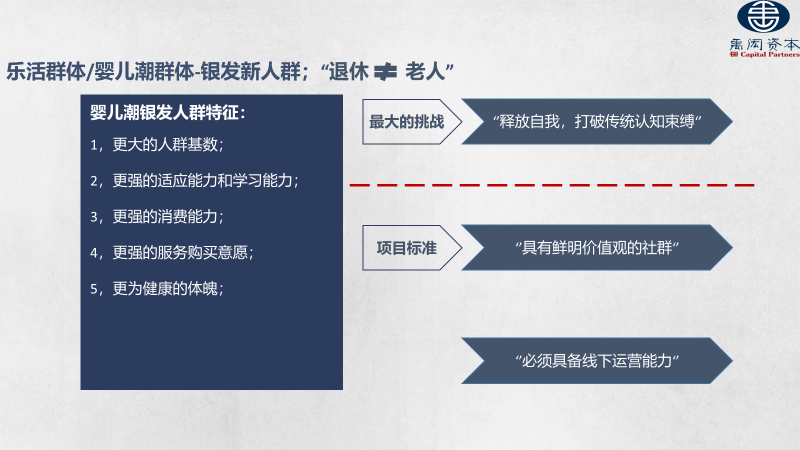 随着婴儿潮群体加快步入退休阶段,养老问题将是我国面临的主要社会问题,银发产业也将成为我国最具发展潜力的朝阳行业之一。作为国内较早进入银发行业的投资机构,我们持续关注婴儿潮老龄化带来的养老需求变化,坚定看好国内养老产业各个领域的发展前景,尤其是运用商业化手段解决养老问题的创新型社会企业。同时,作为国内银发市场的早期探索者,我们愿意分享前期的认知和经验,开放项目资源,与社会各方积极合作加快国内银发产业的发展。