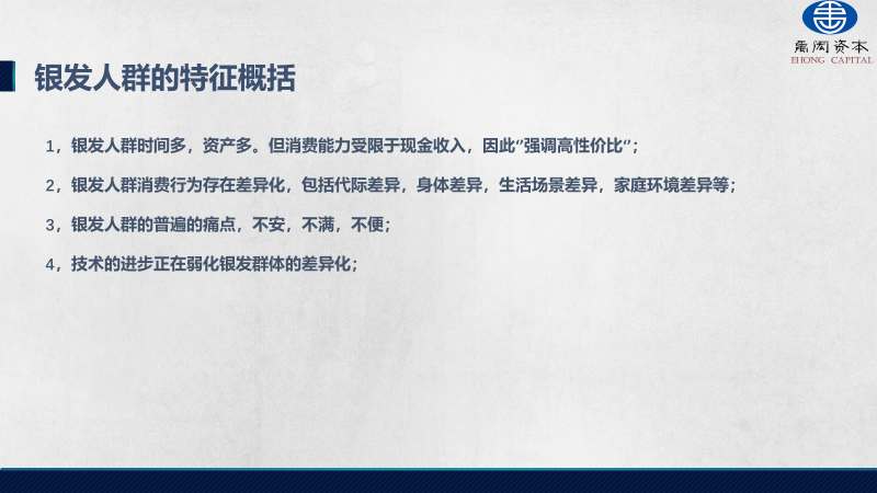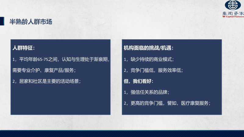 根据过往的研究与投资实践,我对国内银发产业有以下浅见: