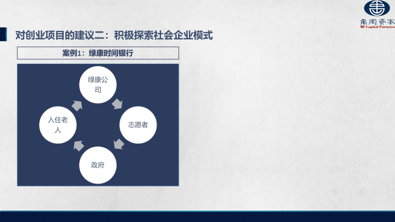 社会企业即以商业手段大规模解决社会问题的企业。养老问题是我国未来十年内主要的社会问题之一,银发人群也是社会的相对弱势群体,因此针对该群体的产品/服务是带有社会属性的,切忌“急功近利”。解决养老问题过程中,商业项目可以积极探索和公益项目的合作与创新。同样,公益项目,当面对一个快速增长的市场时候,也不应抗拒盈利,积极探索持续性的商业模式,从而将社会资源最大化的利用。绿康医养国内首创的“时间银行”项目就是典型的社会企业案例。