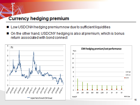 Some currency hedging ideas, USDCNH hedging is at relative low premium due to sufficient liquidities; on the other hand, USDCNY hedging is also at premium, which is bonus return associated with investment onshore from offshore.