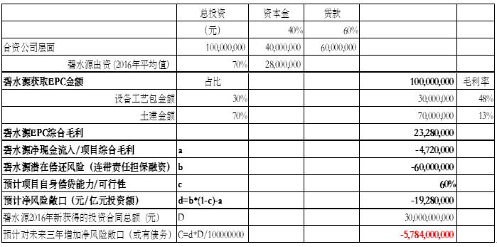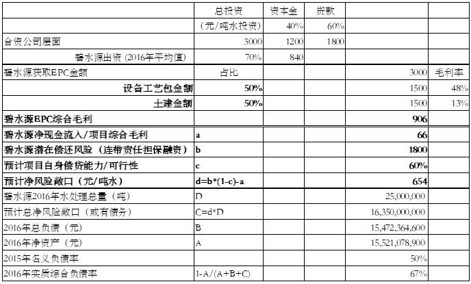 假设碧水源投资的项目自身偿债能力为60%的情况下(由于其参股公司的10年平均投资回报率仅为1%左右),该假设较为乐观),根据2016年业务数据和其商业模式分析(详见表3):