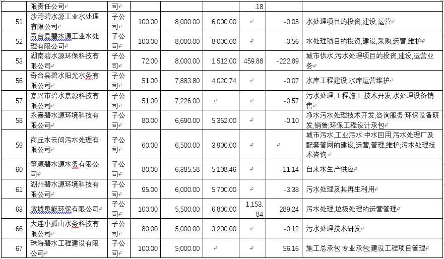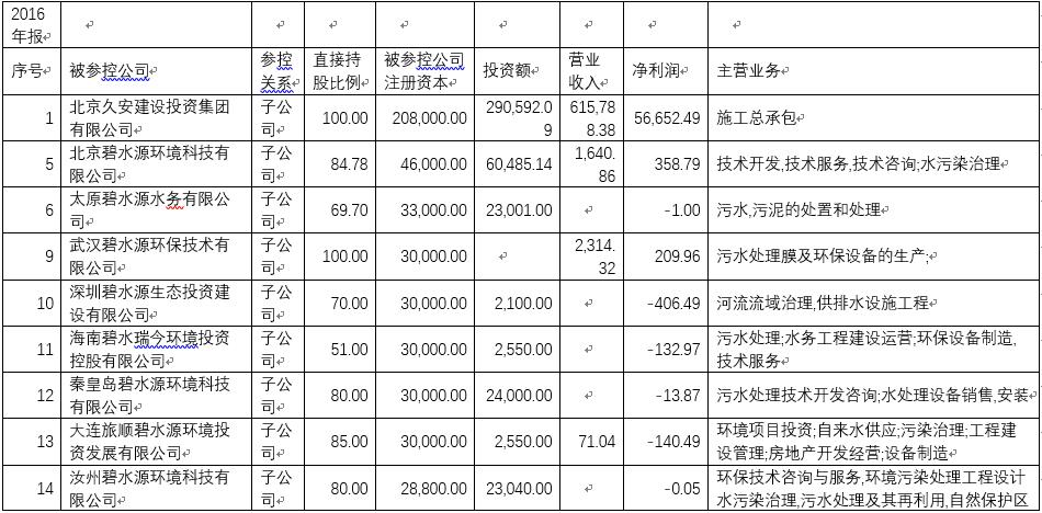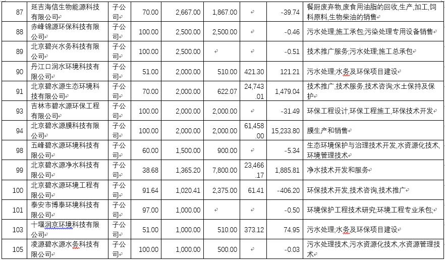 截止2016年12月31日,控股子公司(持股比例平均约80%)共101家(详见附表一),其中,2016年一年,碧水源在全国各地新设立了55家控股子公司(含二、三级子公司)