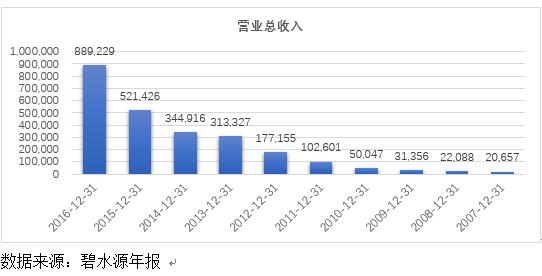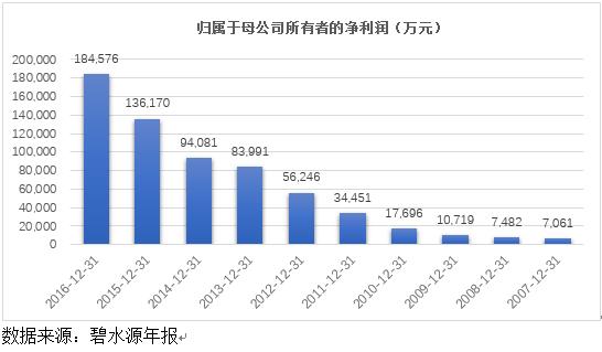 碧水源2007年、2008年、2009年营业收入分别为2亿、2.2亿和3.1亿,归属净利润分别为7000万、7400万和1亿。在上市后6年后,碧水源2016年营业收入已达88.9亿,归属净利润达18.45亿。