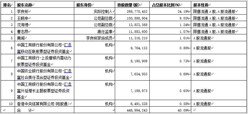 根据wind信息,截至2018年一季度末,公司总股本11.15亿股(A股),其中流通股7.86亿股,占比70%。前十大股东中,持股比例超过10%只有公司实际控制人李良彬和公司副总裁王晓申,前5大股东均为自然人,包括公司管理层、离任高管及实际控制人家族成员,合计持股36.56%。排名第6-10的股东均为金融机构,通过二级市场取得股份,持股比例均不超过1%。从股东构成来看,管理层持股较为集中,无第三方产业投资者。